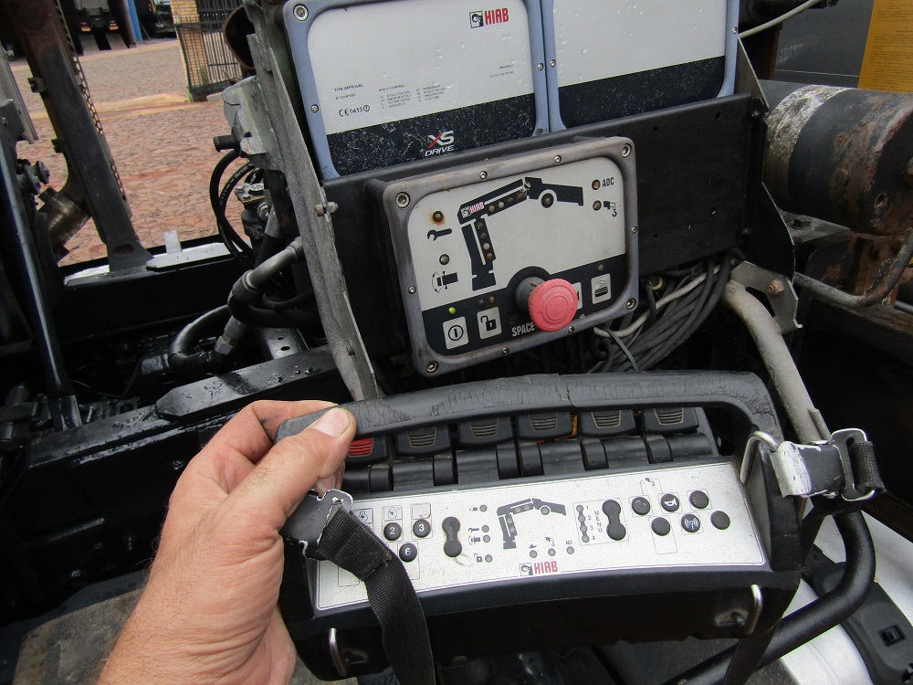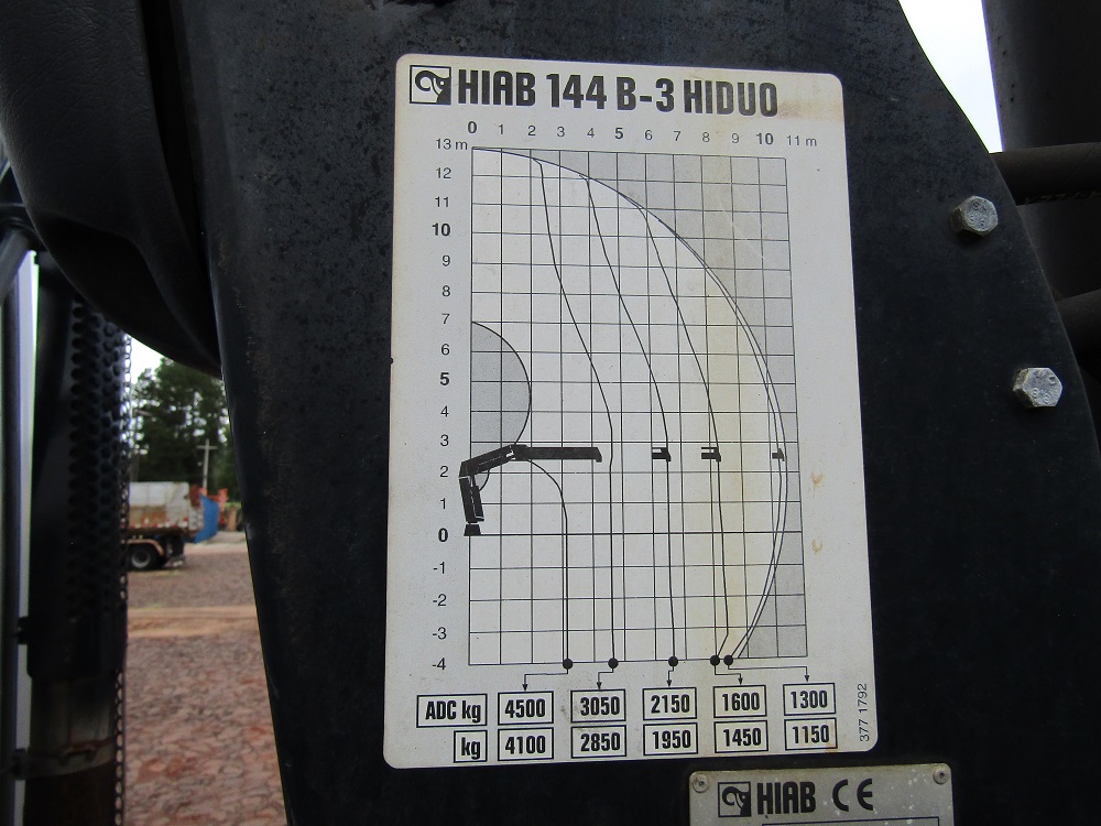- GRUA HIAB 144 B-3 con control remoto que alza: en 2m -4.500 kilos, en 4m – 3.050kilos, en 6m – 2.150kilos, en 8m -1.600 kilos y en 10m – 1.300 kilos.